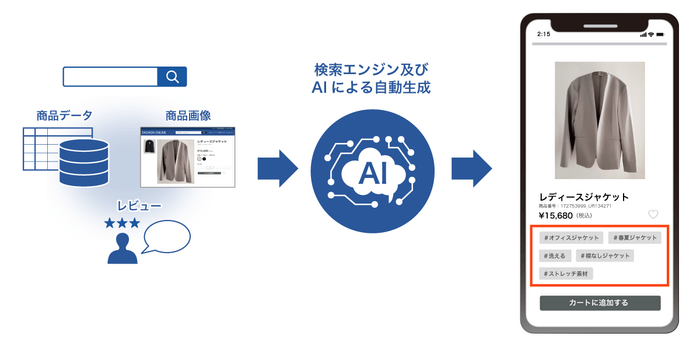 ※「AIハッシュタグ」とは、商品データとユーザーのサイト内行動データをもとに、商品に関連性が高く検索頻度の高いキーワードのハッシュタグを自動生成する機能です。2025年3月には、パーソナライズ機能を追加し、個々のユーザーに最適化されたハッシュタグ表示を実現しています。
