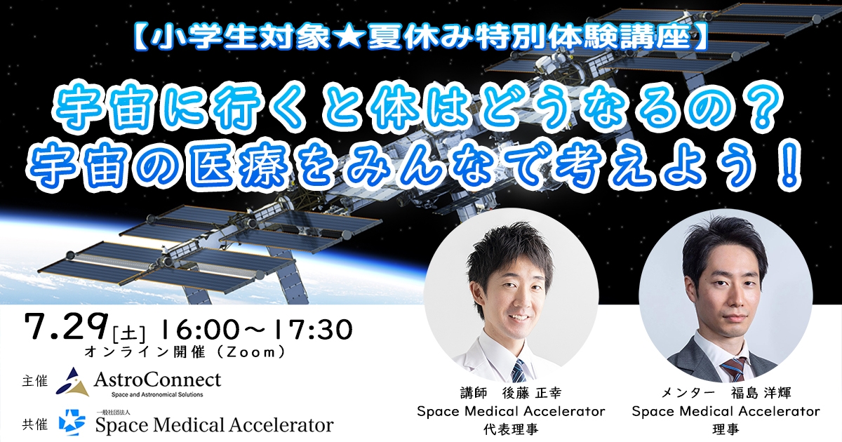 株式会社アストロコネクト(本社:神奈川県川崎市多摩区 代表取締役:荒井大作、以下、アストロコネクト)は、一般社団法人Space Medical Accelerator(所在地:茨城県つくば市吾妻 代表理事:後藤正幸、以下、Space Medical Accelerator)とのコラボレーション企画として、小学生を対象にした「宇宙医療」オンラインワークショップを開催いたします。