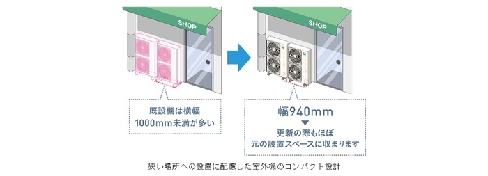 ・大容量クラスの8馬力と10馬力をラインアップに追加しました。天井に設置される照明などの設備との兼ね合いや、冷媒配管経路の確保の難しさなど、施工面の理由から複数台の設置が難しかった大空間にも『FIVE STAR ZEAS』の導入が可能になります。また、省エネ性向上のために室外機を大型化させると、特に都心部など室外機設置スペースに限りのある物件への省エネ性の高い機種の導入が困難になります。『FIVE STAR ZEAS』の8馬力、10馬力は、熱交換器のフィンの枚数を増やし、増やすことで起こりうる風量低下や騒音値の上昇を抑えるためにベルマウスの形状も見直すことで、スタンダードモデル『Eco ZEAS』の8馬力、10馬力と同等のサイズを維持、既設機器からの置き換え需要にも対応します。