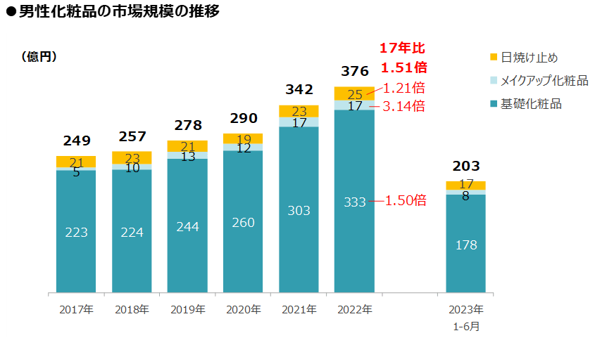〇市場成長率:男性化粧品の市場規模は、2022年までの5年間で約1.5倍。基礎化粧品が牽引