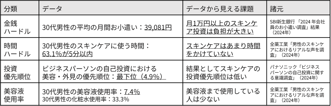 ・スキンケア習慣:30代男性は金銭・時間ハードルからスキンケアの優先順位が低い