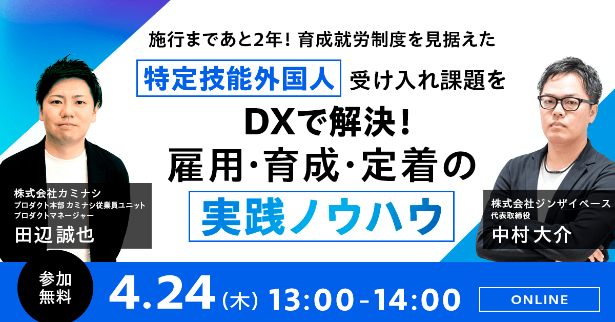 外国人材の紹介・採用コンサルティングを展開する株式会社ジンザイベース(本社:東京都千代田区、代表取締役:中村 大介、以下「ジンザイベース」)は、現場DXプラットフォーム『カミナシ』シリーズを提供する株式会社カミナシ(本社:東京都千代田区、代表取締役:諸岡 裕人、以下「カミナシ」)と共同で、『施行まであと2年!育成就労制度を見据えた特定技能外国人受け入れ課題をDXで解決!雇用・育成・定着の実践ノウハウ』と題したウェビナーを2025年4月24日(木)に開催いたします。