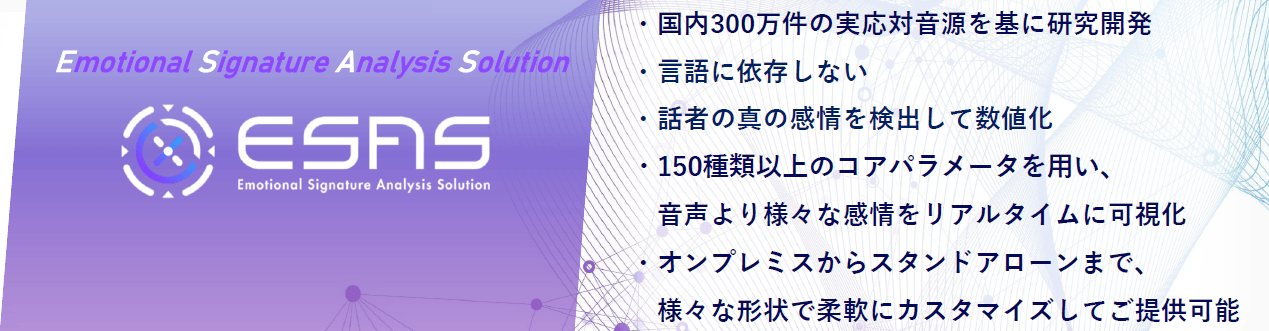 音声感情解析ESASサービスの詳細はCENTRIC株式会社グループ会社、音声感情解析専門会社ESジャパン株式会社ホームページよりご確認ください。