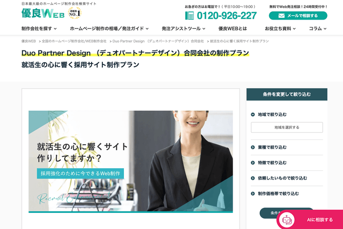 東京都小金井市を拠点にWeb制作や採用支援を手がけるDuo Partner Design 合同会社(以下、DPD)が、日本最大級のホームページ制作会社検索サイト「優良WEB」において「採用サイトが得意なホームページ制作会社」として紹介されました。この掲載は、DPDが提供する採用支援サービスやWeb制作が企業から高く評価された結果です。