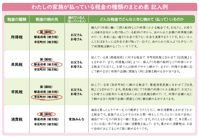 「子どもたちにとっても身近」とは言っても、種類がいろいろあるのが税金です。まずはレシートをチェックしたり、家族にインタビューしたりして身近な税金の種類を知ることからはじめ、自分や家族がどんな税金を払っているのか、国や都道府県・市区町村にはどんな税金が集められているのかなどを調べていく自由研究です。税金との関わりについて学ぶことができ、「調査シート」「税金の種類まとめ表」「国や都道府県、市区町村の税金チェックシート」「まとめ用シート」など自由にダウンロードできるワークシートも用意。こちらは学校における租税教育教材としても活用でき、授業の中で調べたりまとめたりするのにも役立ちます。