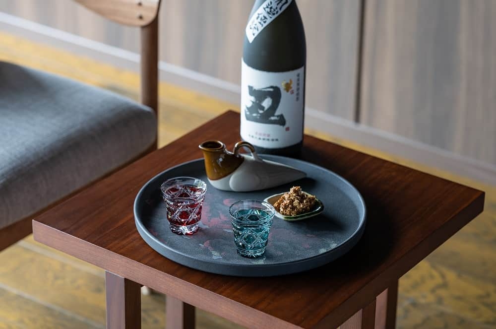 客室では、鹿児島県奄美大島で限定千本しか製造されない焼酎「開運伝説」を提供します。その年を無事に過ごせたことに感謝し、翌年の努力を決意する蔵人が丹精こめてつくる焼酎はコクと香りの強い味わいです。そんな貴重な焼酎を