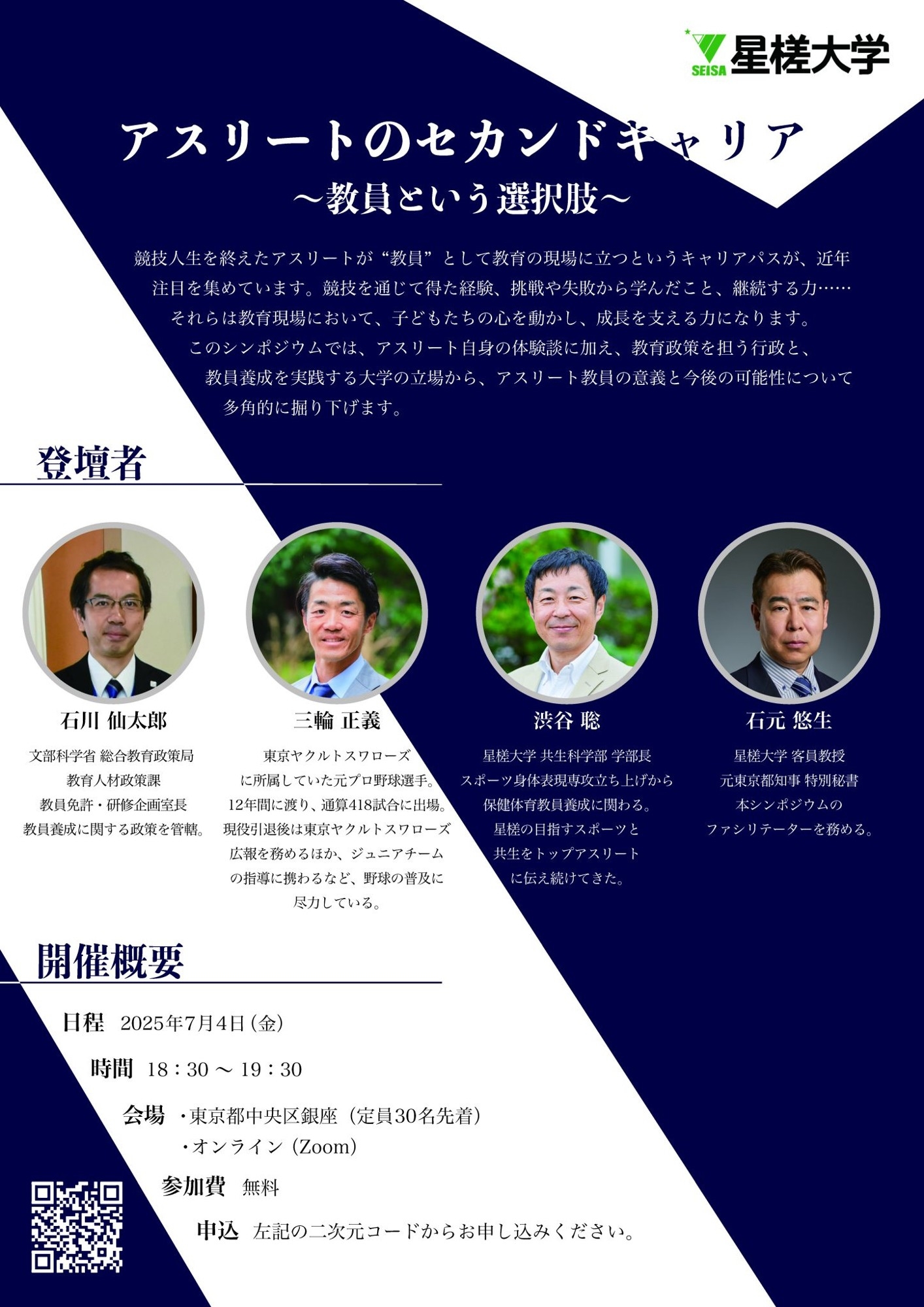 本シンポジウムでは、アスリート自身の教員転身に関する体験談に加え、教育政策を担う行政と、教員養成を実践する大学の立場から、アスリート教員の意義と今後の可能性について多角的に掘り下げます。