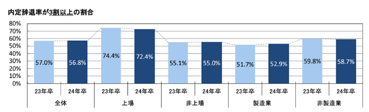 下記に示す調査結果では、上場企業であっても内定辞退率が3割を超える企業が多いことがわかります。