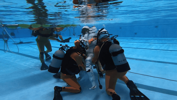 山田さんが「水難救助隊」として川で訓練をするのはまだ6回目。川のどこにあるかは知らされていないダミーの人形を確保したら訓練終了というミッションで、20分を目標に3人のチームで水深3.6メートルの川底まで潜ります。