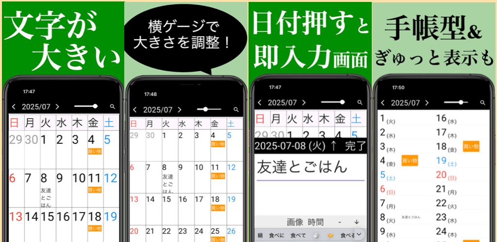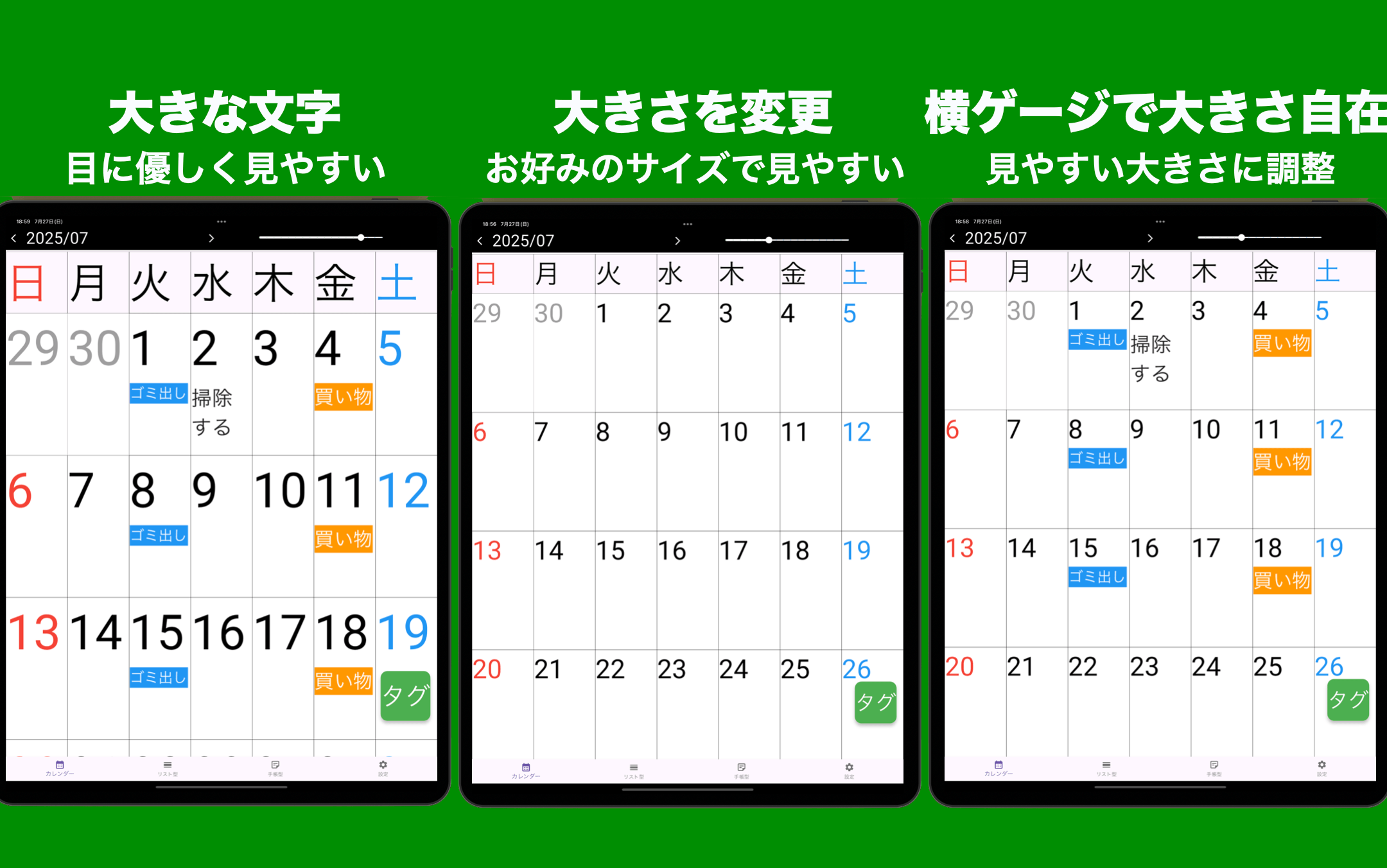 このカレンダーアプリが、40代・50代・60代以上の方で、文字の小ささに悩んでいた方々や、カレンダーを諦めていた方々の助けになればと考えています。