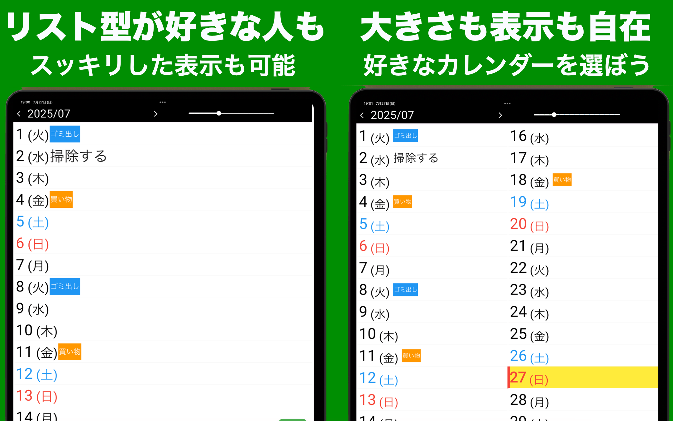 →特に通常のカレンダーだと横に月から日曜を並べる必要がある為、どうしても文字の大きさと見やすさに制限が出てしまいます。その場合に備え、「リスト型」や、「2列手帳型」のカレンダーを用意しています。
