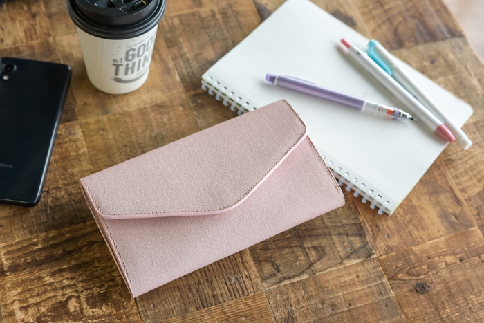 大きく開く設計で、何がどこに入っているかわかりやすいギャルソン型財布。小銭も見やすく、出し入れもしやすいです。