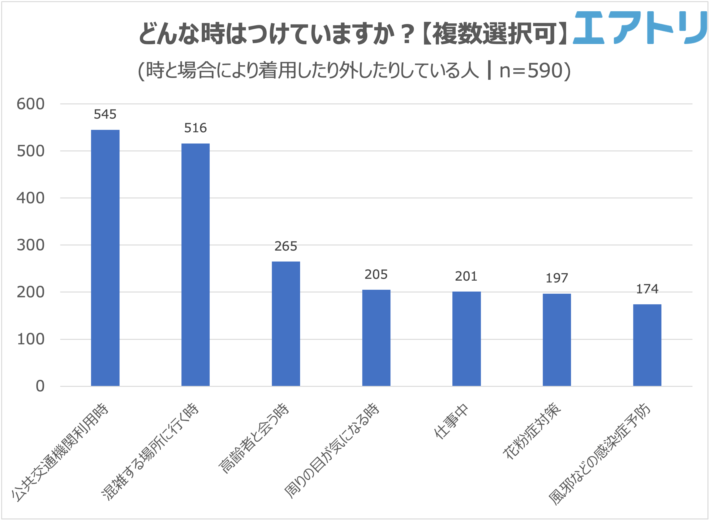 時と場合によりマスクを着用したり外したりしている人に、どんな時は着用しているかを聞いたところ、1位が「公共交通機関利用時」で545票、2位が「混雑する場所に行く時」516票となり、この2つが3位以下と大きく差をつける結果となりました。3位は「高齢者と会う時(265票)」、4位が「周りの目が気になる時(205票)」、5位が「仕事中(201票)」と続きました。