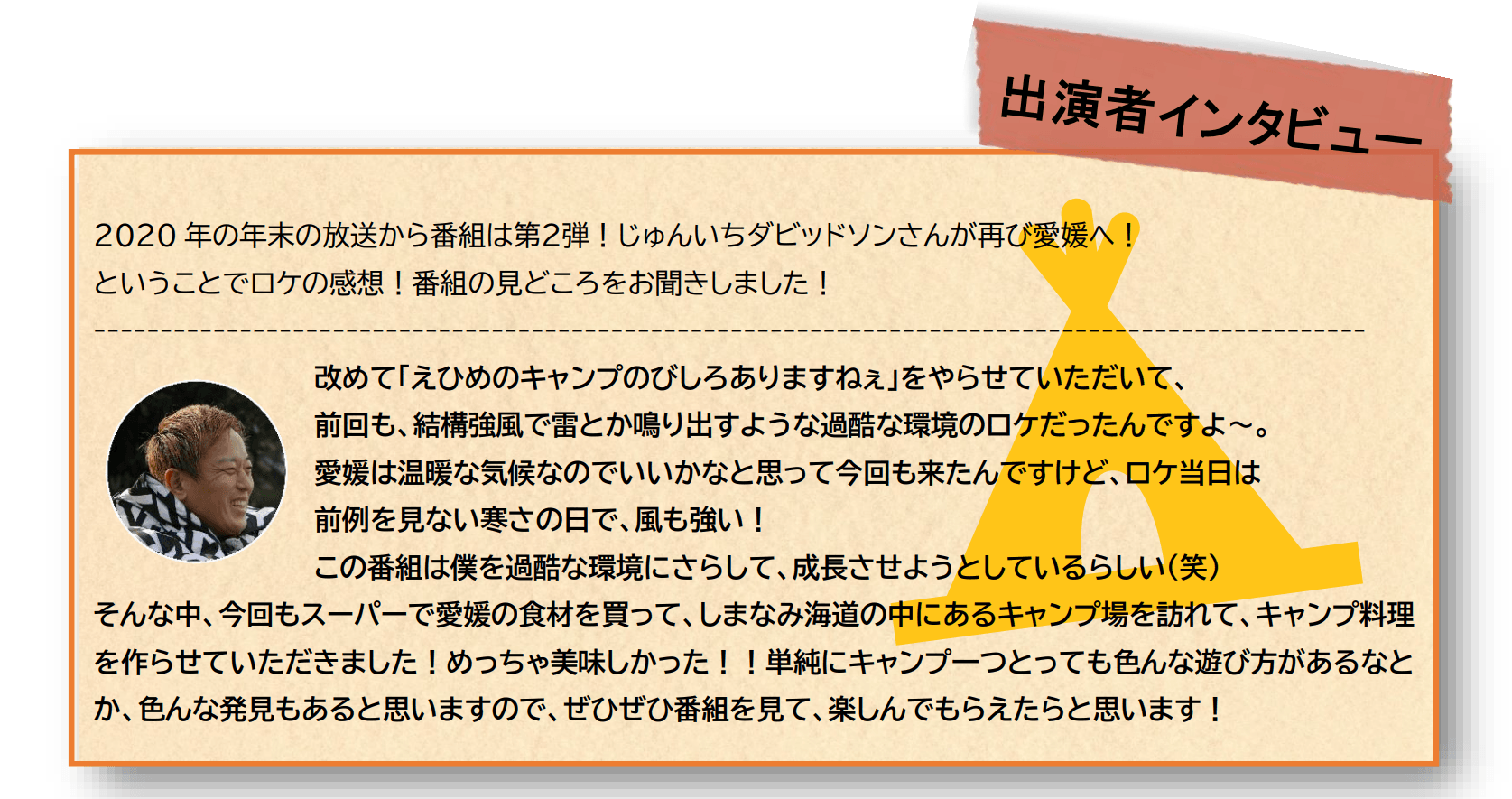 自然あふれる愛媛のキャンプ場に「キャンプ芸人」として注目を集めるじゅんいちダビッドソンが再び!!