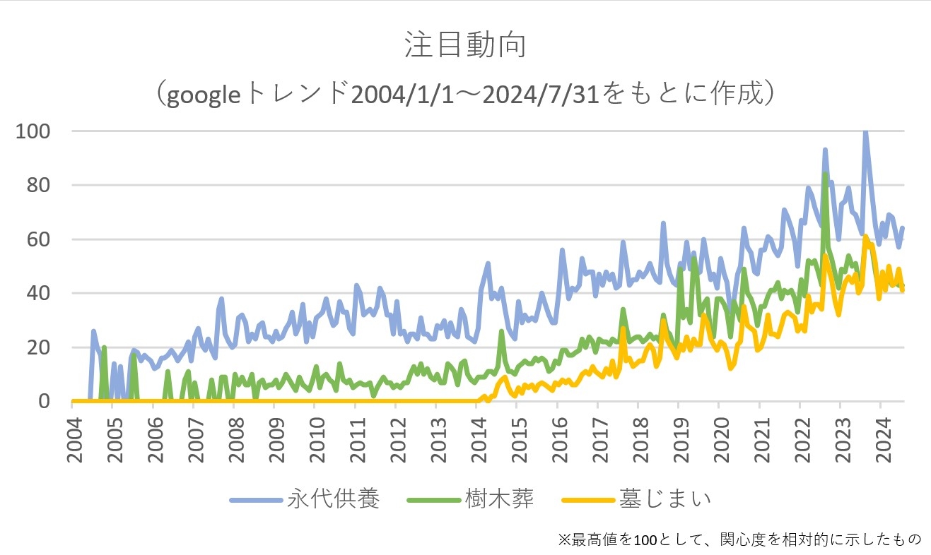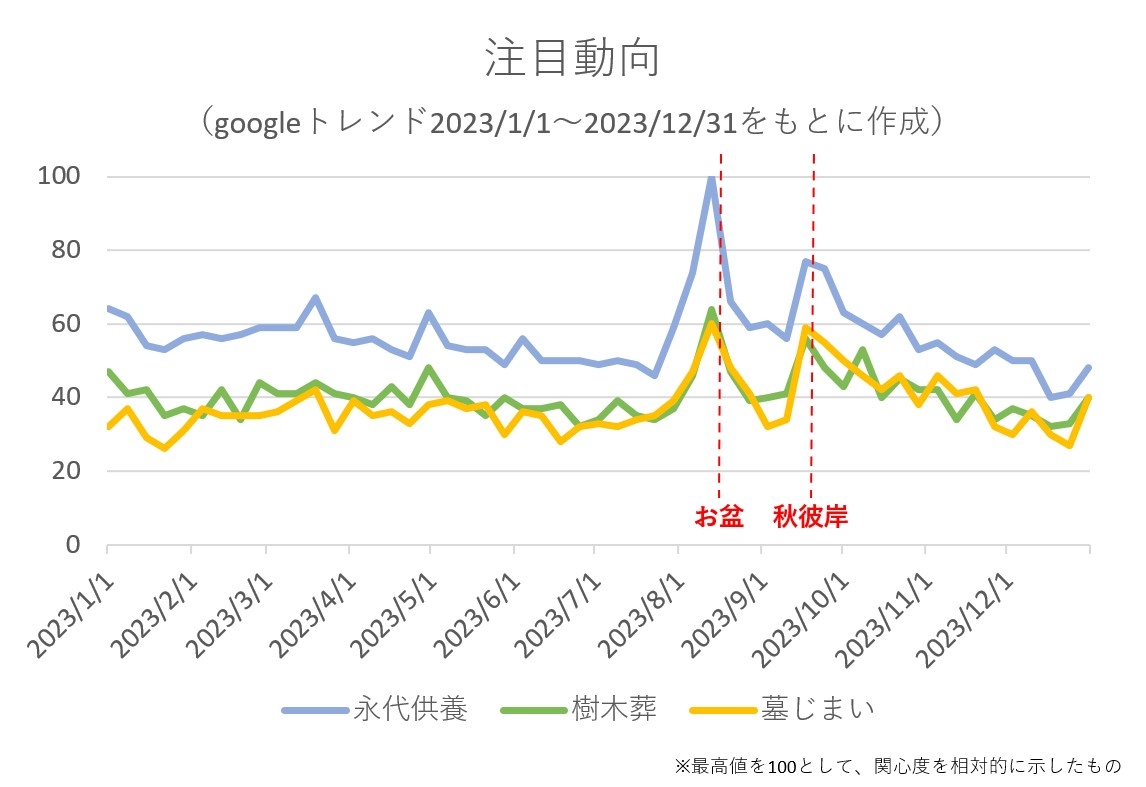 インターネット上での検索ボリュームから関心度が分かるGoogleトレンドで、お墓に関連した語句である 「永代供養」 「樹木葬」 「墓じまい」 のキーワードの検索推移をみると、1年のうちで8月のお盆前後と、9月の秋彼岸の頃が突出して検索ボリュームが高いことが分かります。