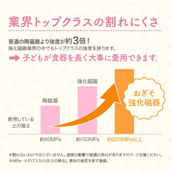 従来の陶器と比べて2〜3倍の強度を持ち、割れにくいため、学校給食の現場でも多く導入されています。
