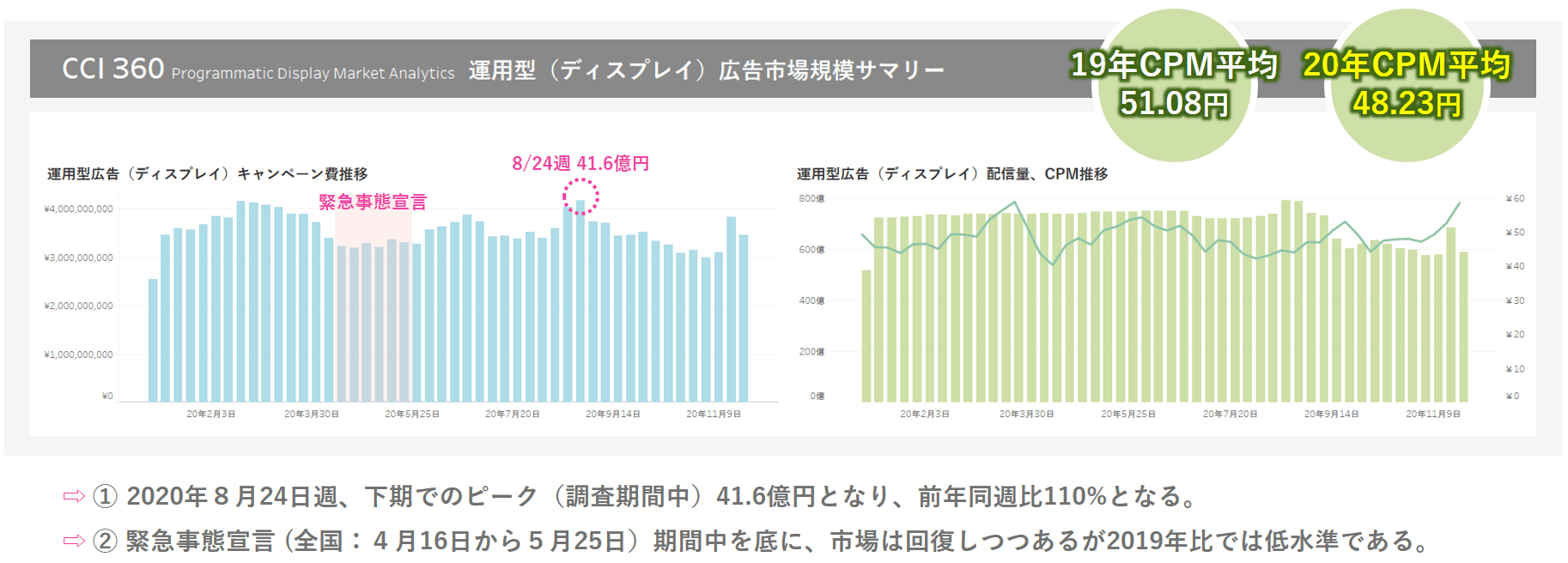 運用型ディスプレイ広告のキャンペーン費用は2020年8月24日週に2019年12月1週と同水準に戻るが、2020年の平均CPMは48.23円(11月末時点)と、2019年の平均CPM 51.08円の水準には戻っていない。配信量も2020年下期は減少傾向。