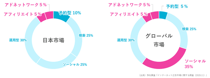 キャンペーン費用の配分では、グローバルでは日本市場に比べ予約型の割合が少なく、その分ソーシャルの比重が大きい。