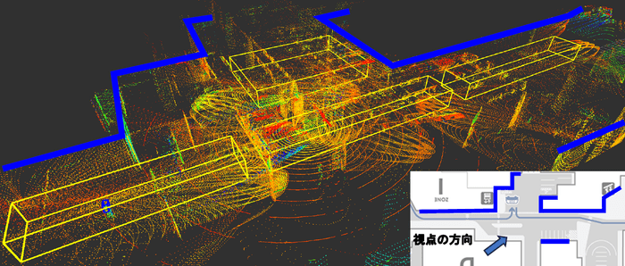 建物に設置した複数台のLiDARから取得したロボット周辺の車や人といった動体のデータをエッジコンピュータで解析し、デジタルツインを構築します。その後、デジタルツインから、ロボットの自動制御に必要な空間情報をリアルタイムに抽出します。