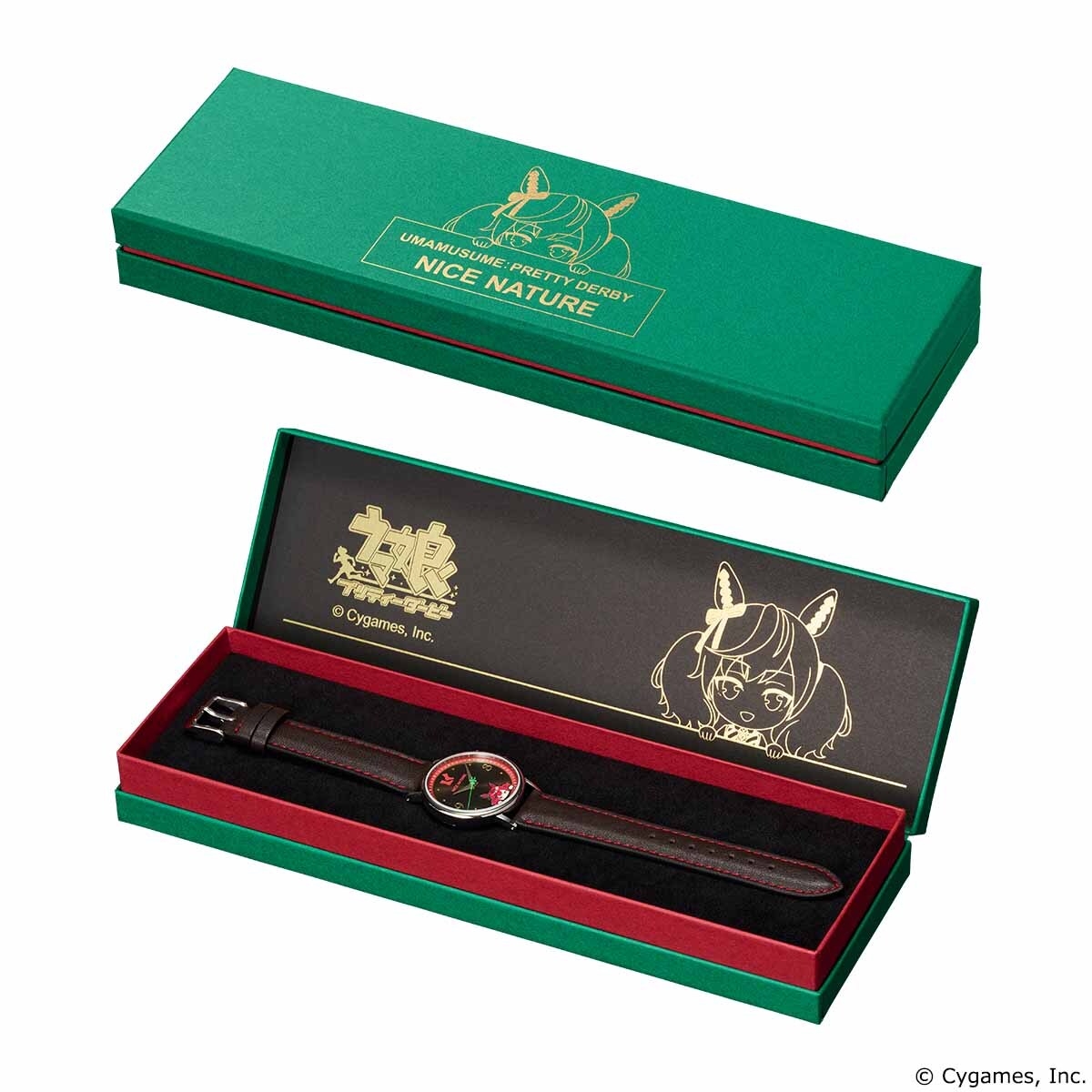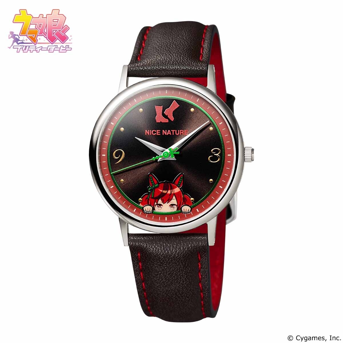 ナイスネイチャをイメージした、ダークブラウンの腕時計。文字盤の外周や秒針、バンドのステッチや裏地には、勝負服にちなんだクリスマスカラーのレッドやグリーンが使われています。秒針には、耳カバーのリボンのモチーフがあしらわれています。