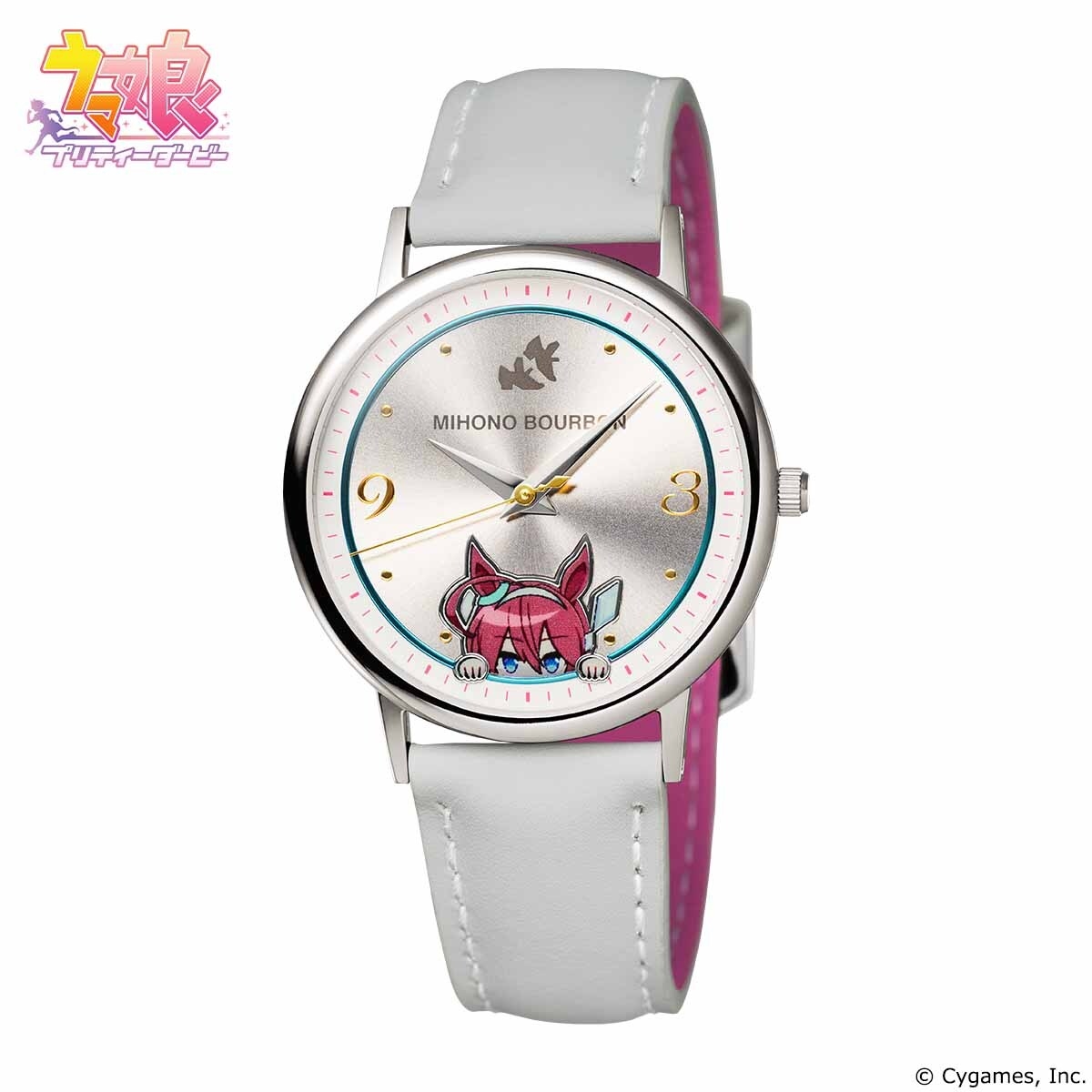 ミホノブルボンをイメージして、メタリックなシルバーカラーの文字盤にライトグレーのバンドを組み合わせた腕時計。バンドにはホワイトのステッチ。秒針には、ダイヤ型の特徴的な髪飾りのモチーフがあしらわれています。