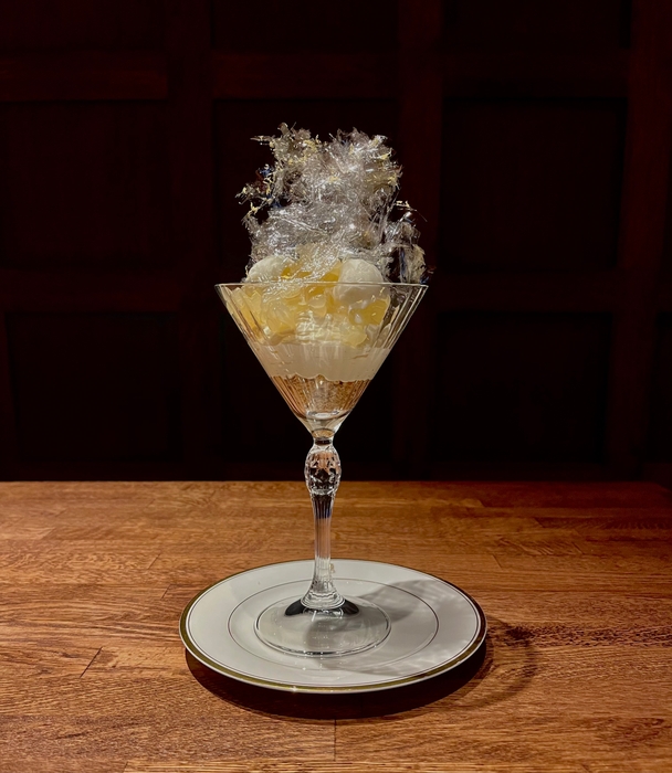 コースの始まりを彩るのは、柑橘の香りとホワイトチョコレートの穏やかな甘さを融合させたグラスデセールです。文旦の軽やかな酸味、フロマージュブランの優しいコク、そして飴細工で仕上げた繊細な美しさ。これらの要素が見事に調和し、コースの幕開けにふさわしい一品となっています。