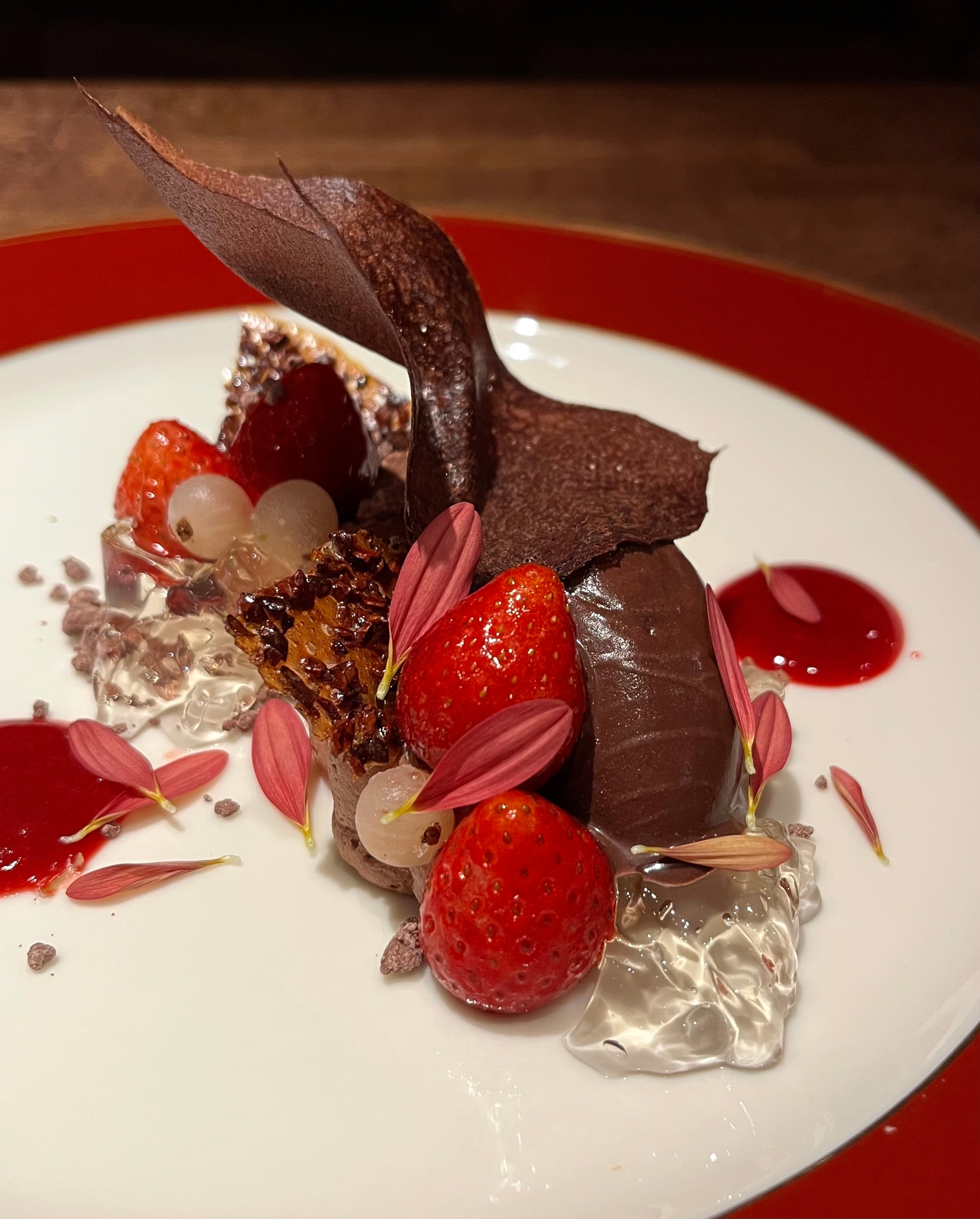 コースの最後を飾るのは、ショコラノワールとフリュイルージュのデグリネゾン。濃厚なチョコレートと素材を変えた様々なカカオのパーツに、ベリーの爽やかな酸味をアクセントとして加えました。甘さと酸味の絶妙なバランスが、食べやすさと洗練さを兼ね備えた一皿を生み出しています。