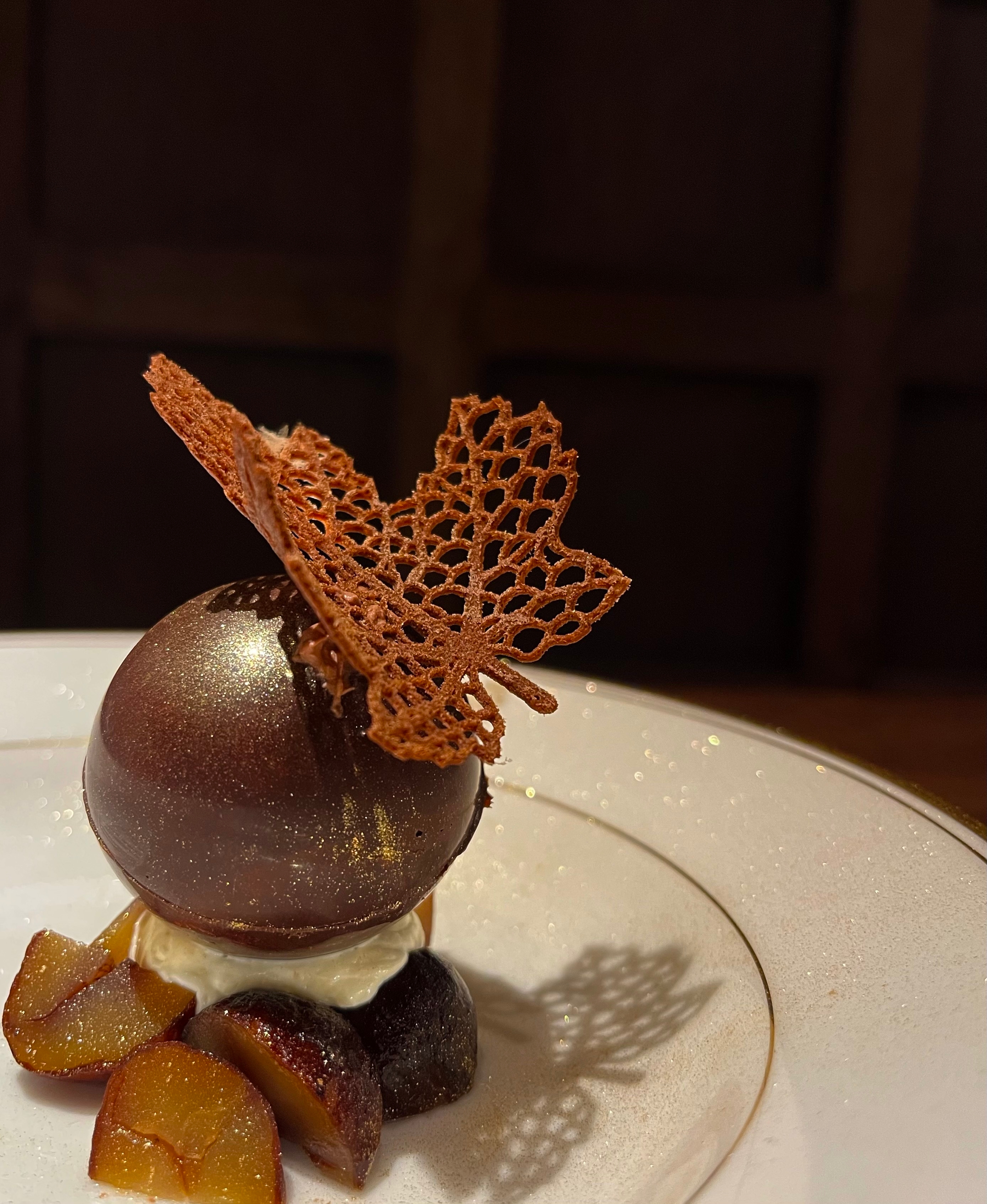 次にご提供するのは、チョコレートの球体に閉じ込めたメレンゲ、ミルクアイス、そしてカシスソース。テーブルで注がれる温かな栗とミルクチョコレートのスープが、この繊細な球体を溶かしながら、驚きとともに様々な食感と温度差をお楽しみいただけます。一口ごとに広がるチョコレートの濃厚さと栗のほっこりとした甘さが、冬の寒さを忘れさせてくれるでしょう。