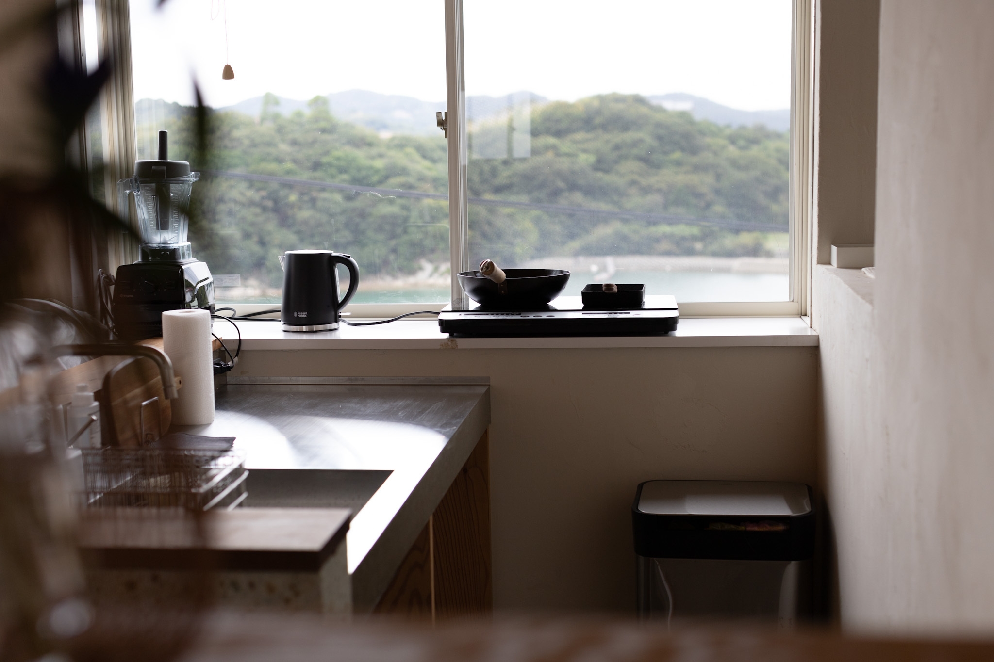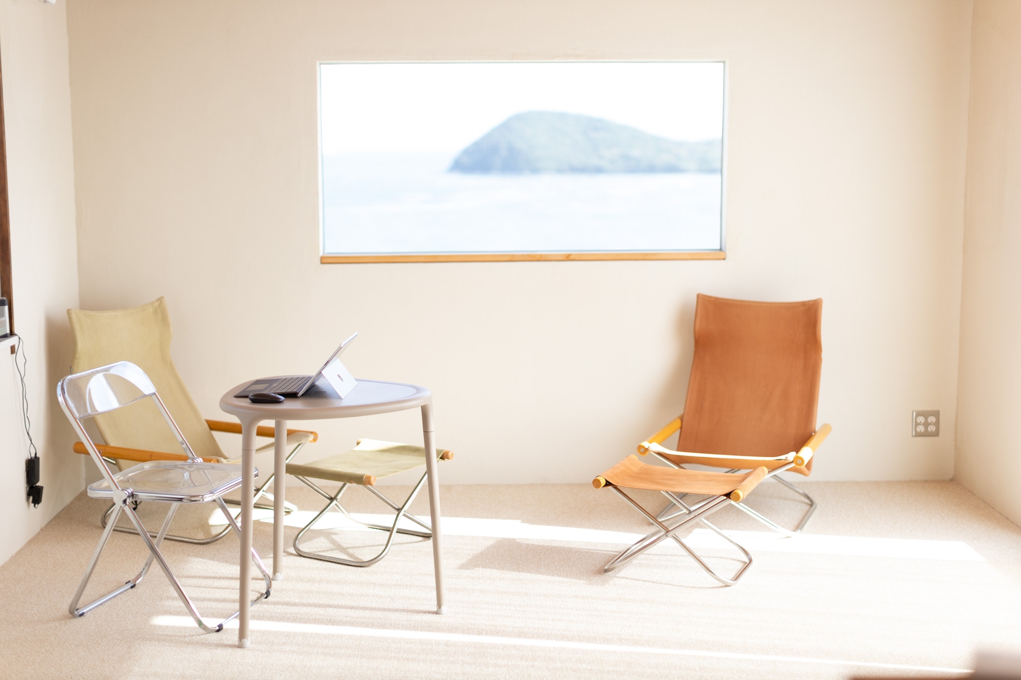 絵画のように配置された窓から見えるのは、季節や時刻によって全く違う表情を見せる、穏やかな瀬戸内海です。家具はすべて収納することができ、空間を自由に、広々とご使用いただけます。キッチンには調理器具やカトラリーを完備し、日生近隣の市場で購入できる地元食材を調理していただけます。WiFiもあるので、長期滞在が可能です。離島暮らしを検討中の方の、予行演習としてもおすすめです。