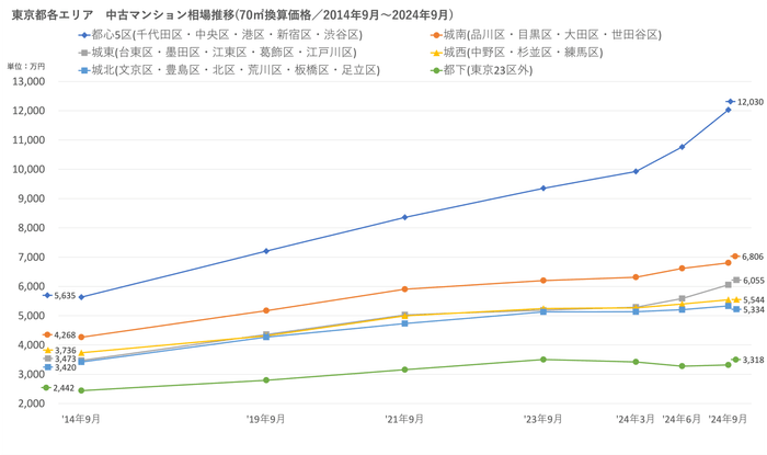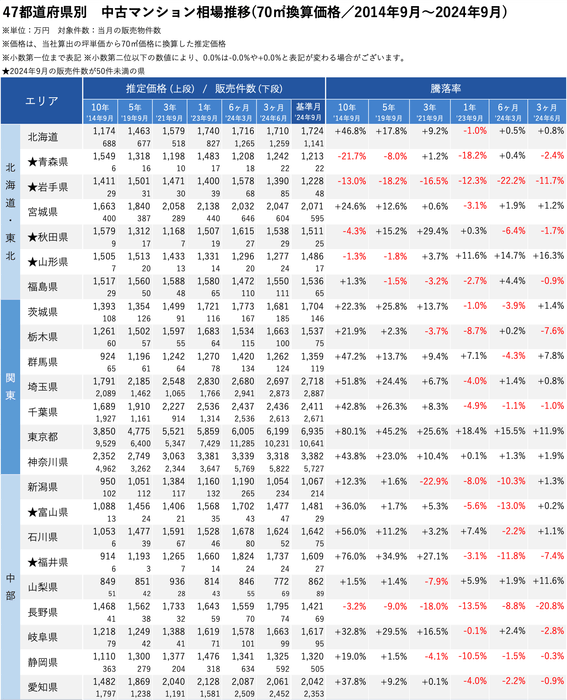 「不動産×WEB×ビッグデータ」の領域で、さまざまな不動産テックサービスを展開する株式会社ワンノブアカインド(本社:東京都港区、代表取締役社長:川島 直也、以下当社)は、当社が運営しているマンション情報サイト「マンションレビュー」の保有データを元に、全国の2024年10月の中古マンション相場を調査。坪単価をベースに70㎡での価格に換算した「中古マンション価格」*1について、10年前・5年前・3年前・前年からの推移を都道府県別・エリアごとにまとめましたので、発表いたします。