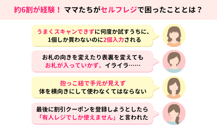 小さな子どもを連れて買い物をするママならでは声も届きました。子育て中の家庭にとってはセルフレジがむしろ負担となる場面も少なくないようです。