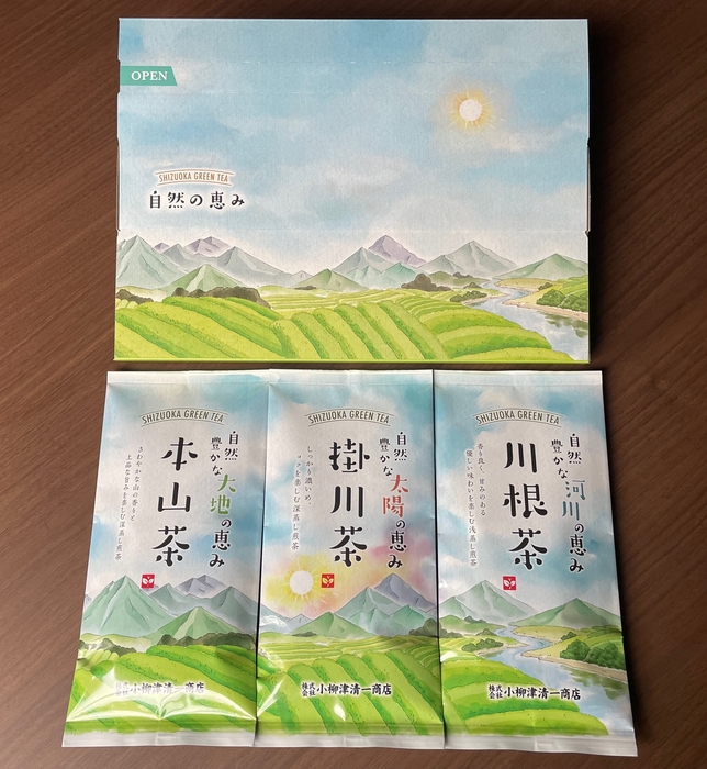 商品の企画担当者は、地域ごとの自然環境に着目し、それが緑茶の風味にどのように影響するかを表現したいと考えました。これにより、山間地域の自然に育まれた「本山茶」の芳醇な香りとコク、清らかな水をイメージした「川根茶」の甘みとすっきりとした味わい、太陽光をたっぷり浴びた平地で生まれた「掛川茶」の深蒸し製法によるまろやかでキレのある味わいが、一つのセットで楽しめるよう工夫されています。