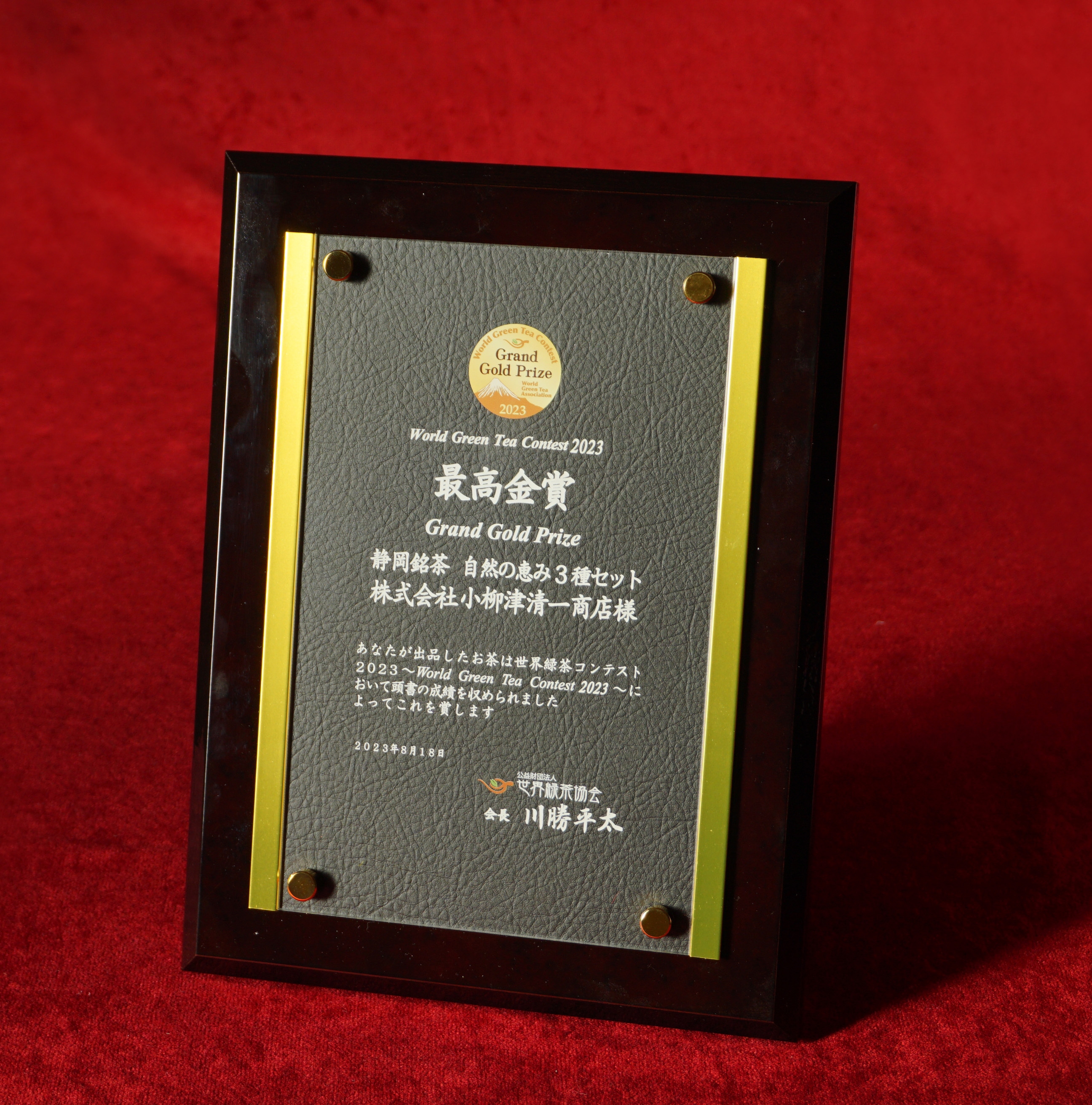 静岡県内の自然と歴史が息づく風土を背景に、株式会社小柳津清一商店が提案する「静岡銘茶 自然の恵み三種セット」が、「世界緑茶コンテスト2023」において最高金賞を受賞し、2023年12月25日に授賞式が行われました。