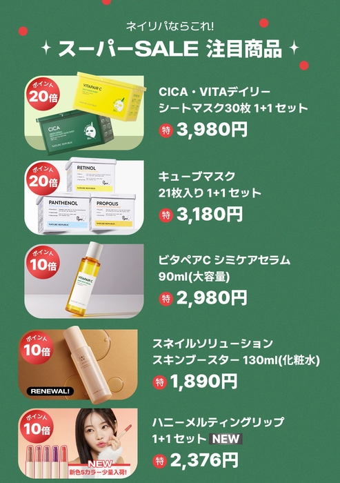 さらに2023年12月4日(月)午後8時から12月11日(月)午前1時59分まで開催される楽天のスーパーセールに参加、「ハニーメルティングリップ」含むネイチャーリパブリックの商品をお買い求め頂いた方のための豪華イベントを実施いたします。ぜひこの機会にチェックしてみてください。