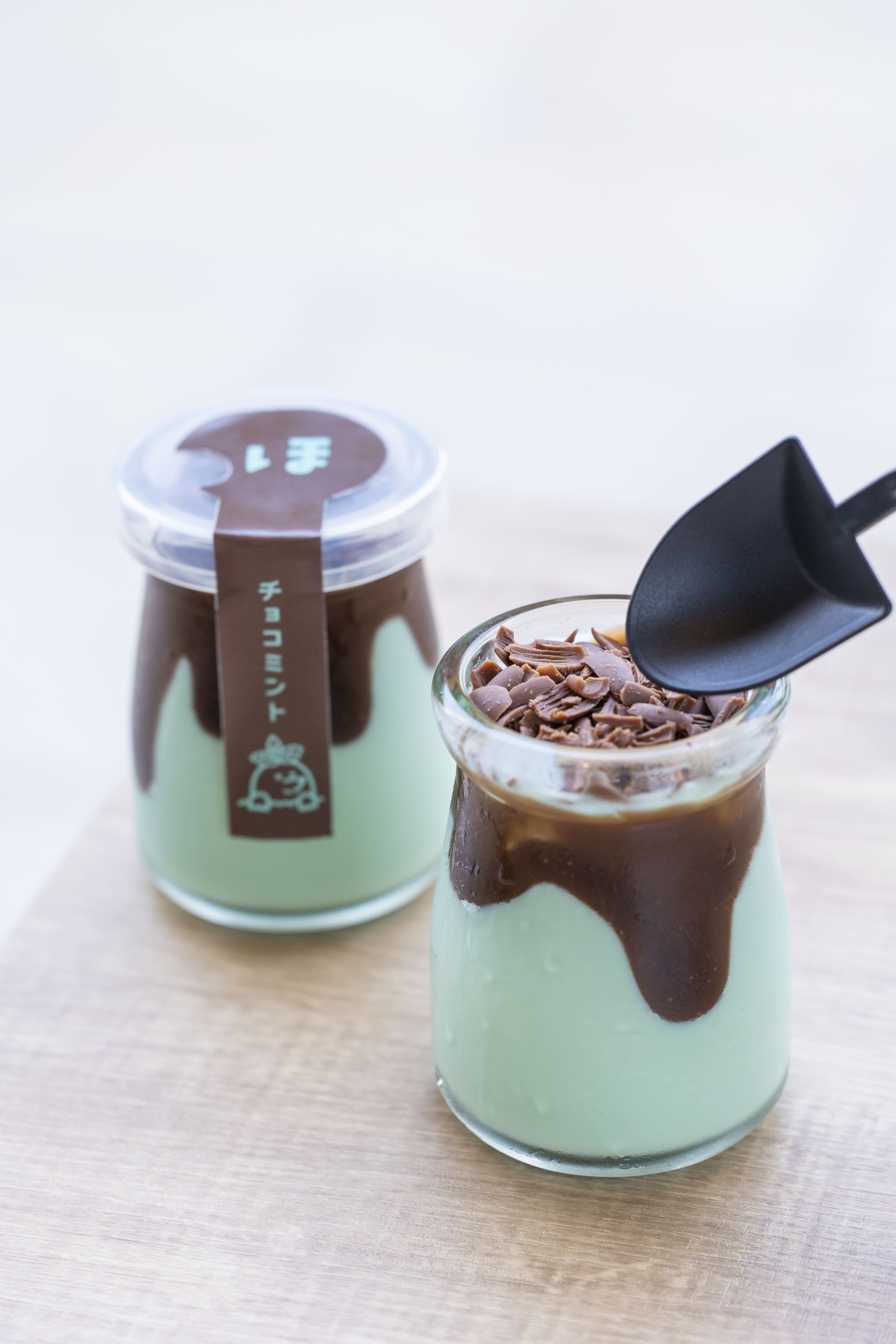 マスカルポーネチーズを使った爽やかなミントプリンの上に、うすく削ったミルクチョコレートをのせました。専用のスコップスプーンでミントプリンとチョコレートを一緒に「ほれほれ」して食べる季節限定、数量限定のプリンです。