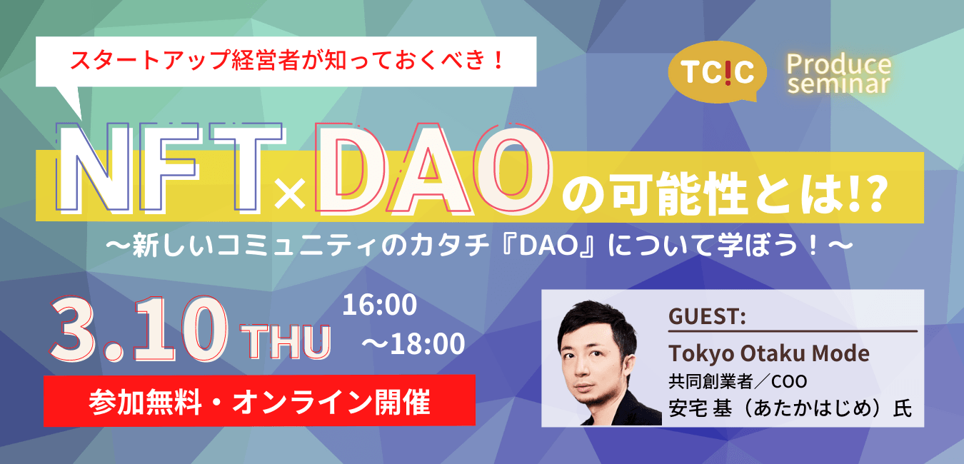 株式会社ツクリエ(本社:東京都千代田区、代表取締役:鈴木英樹)が東京都より運営受託をする、東京コンテンツインキュベーションセンター(以下、TCIC)は、今注目のNFTとDAO(分散型自律組織)をテーマにした、TCICプロデュースセミナー「NFT×DAOの可能性とは!?~新しいコミュニティのカタチ『DAO』について学ぼう!~」を3月10日(木)に開催します。