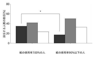 また、紙の各使用率ごとに講義の記録スタイルの違いを調べたところ、紙の使用率が90%以下の人に比べ、100%の人の方がより内容を可能な限り全て記録しようと努める傾向にあることがわかった(p < 0.05)。