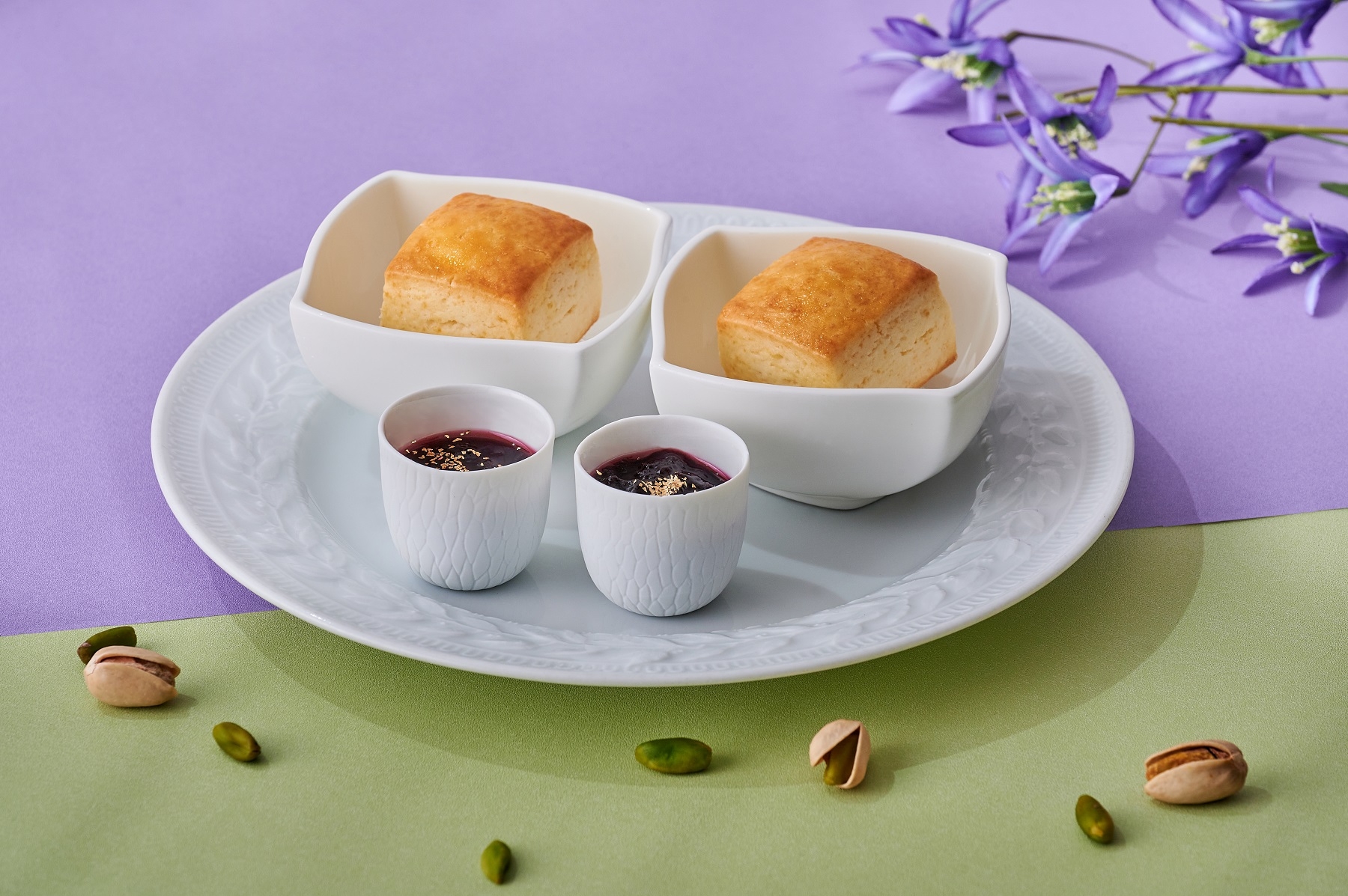 『パステルカラーアフタヌーンティー~パープル&ピスタチオ~」は、秋に旬を迎えるナッツの女王‟ピスタチオ”をふんだんに使用した、「ベイクドピスタチオ」や 「ピスタチオ薫るタルト」、今年のトレンド‟パープル”カラーをテーマにした「カシスのオペラ」「パープルカラーのホワイトチョコレートとカシスのムース」、シャインマスカットをアクセントにした「赤ワインと白ワインのジュレ」をなどご用意。