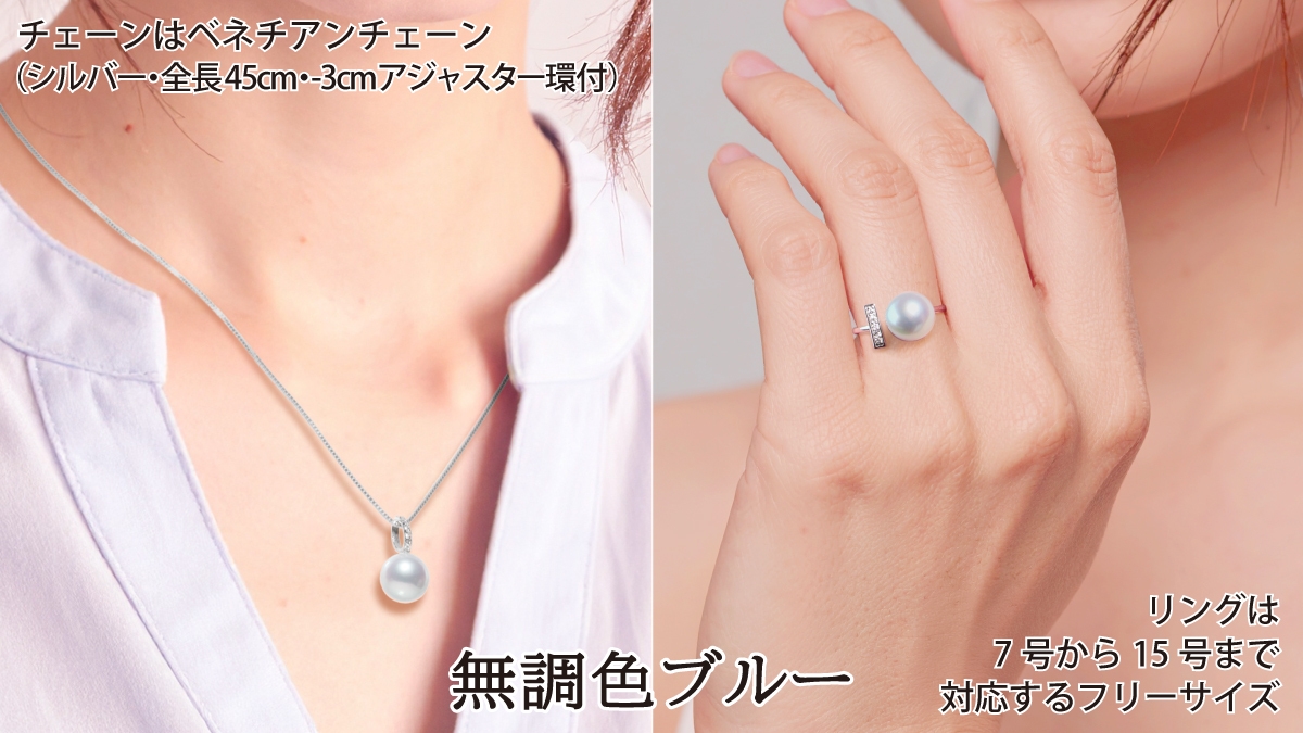 いずれも、アコヤ真珠は、人気の無調色ブルーと、定番のホワイトピンク系の2カラーをご用意いたしました。