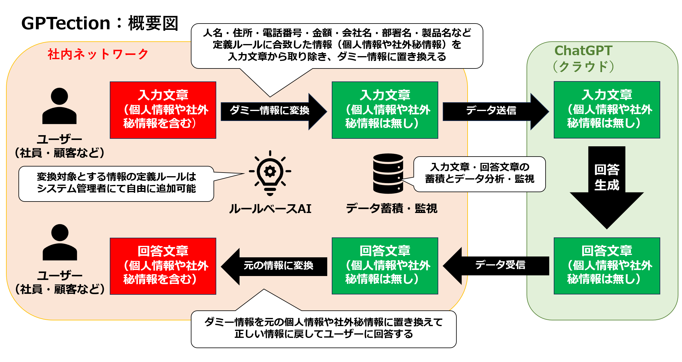 そこで、株式会社AIロボティクスは、システム的に個人情報・機密情報の流出リスクを解消する新しいセキュリティ技術「GPTection」を開発いたしました。本技術により、個人情報・機密情報の流出防止と、企業でのChatGPTの活用範囲の拡大に貢献いたします。