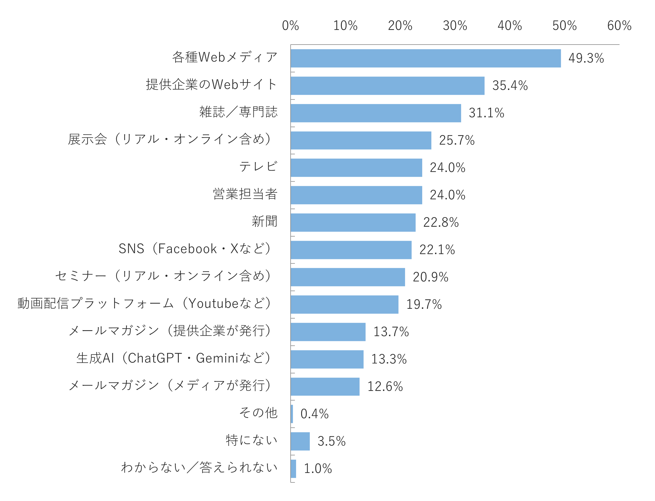 製品やサービスの検討段階で収集した主な情報源は、「各種Webメディア(49.3%)」が最多となり、「提供企業のWebサイト(35.4%)」、「雑誌/専門誌(31.1%)」、「展示会(25.7%)」が続きました。