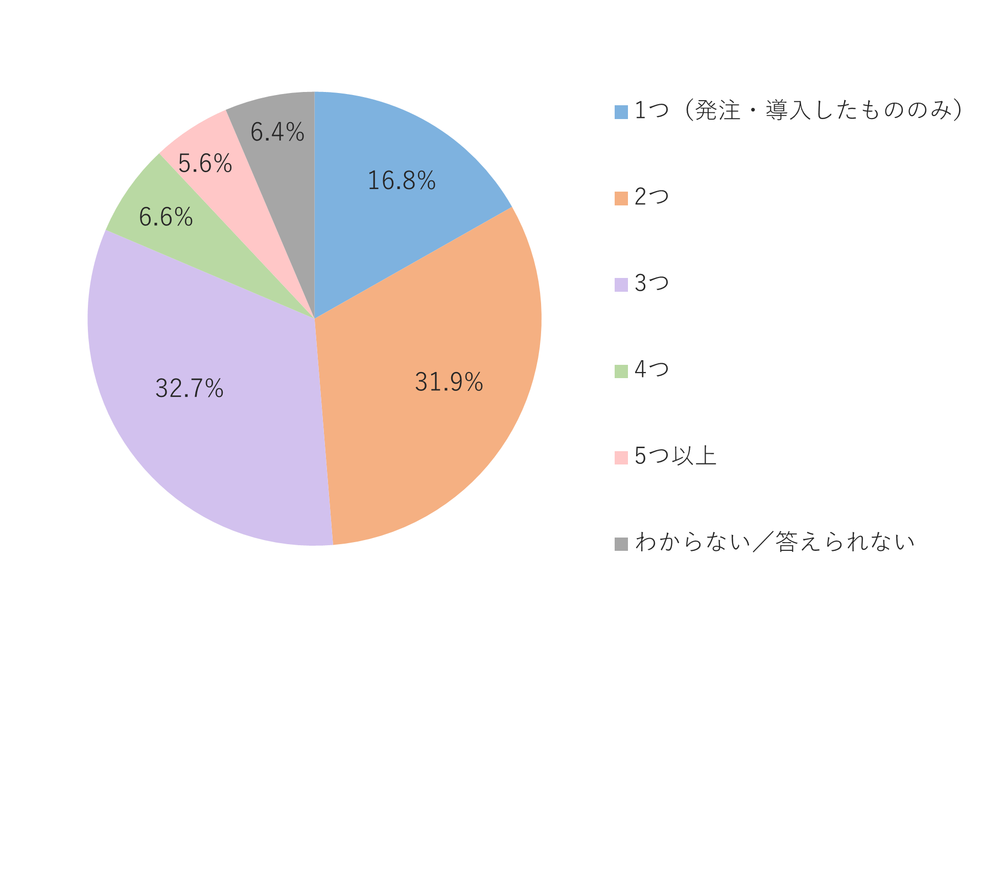 検討時に比較した製品/サービスの数は、発注・導入したもののみとなる「1つ」が16.8%、「2つ」が31.9%、「3つ」が32.7%でした。つまり、8割以上(81.4%)のケースで比較対象を3つ以内に絞っていたことがわかりました。