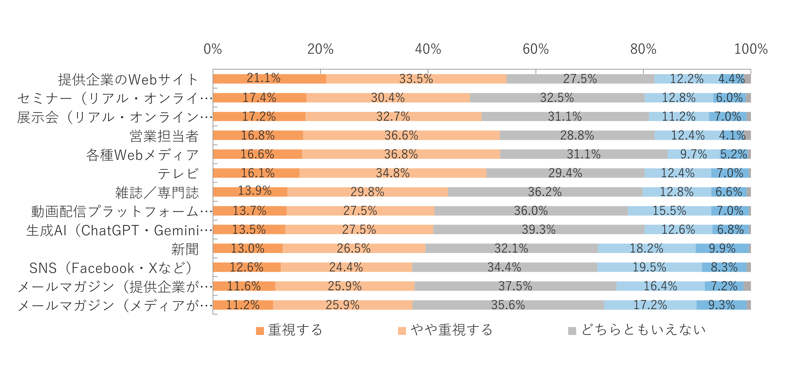 2025年以降、製品やサービスの検討時に重視する情報源として、上位から「提供企業のWebサイト(21.1%)」、「セミナー(17.4%)」、「展示会(17.2%)」が続きました。先述したQ[検討する段階で収集した主な情報源]の結果と比較すると、特に「セミナー」と「展示会」が重視される傾向が強いですが、「やや重視する」までを含めて考えますと、「営業担当者」や「各種Webメディア」にも配慮が必要です。