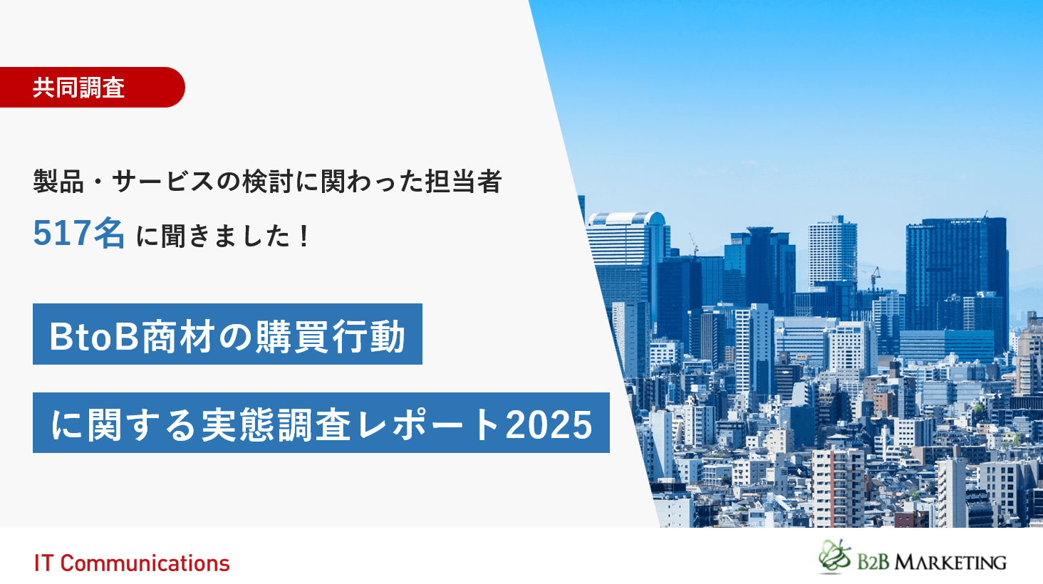 株式会社ITコミュニケーションズ(所在地:東京都千代田区、代表取締役社長:加藤 浩志)は、B2Bマーケティング株式会社(所在地:東京都千代田区、代表取締役:堀首 裕芳)と共同で「BtoB商材の購買行動に関する実態調査」を実施し、このたび調査レポートを公開いたしました。