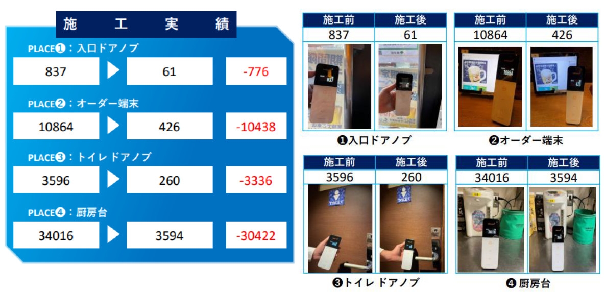試験方法:ATPふき取り検査(A3法)※で作業前後の汚れの数値を計測したところ、作業前と比べて作業後の数値が大幅に減少しており、高い抗菌・抗ウイルス効果を生んだことが分かります。光触媒は蛍光灯などの光が当たると、抗菌・抗ウイルス作用が発生します。よって、コーティング後は日常生活を送るだけで、この数値はどんどん下がっていきます。