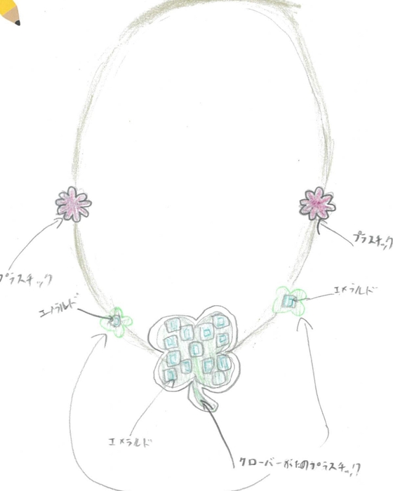 受賞作品:幸福の象徴であるクローバーを用いて「クローバーのおかげでつけている間は幸せになってほしい」という想いが込められています。自分が着用するだけではなく、誰かにプレゼントすることを想定した上で相手のことも考えられており、ネックレスを通じてコミュニケーションを取る。独創性を感じるデザインです。