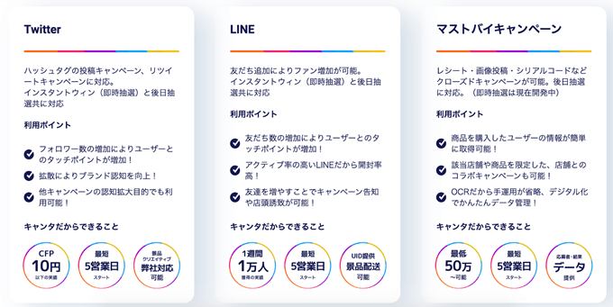 「キャンタ」は、販売促進キャンペーンにおける「キャンペーンの設計」「キャンペーンの運用」「顧客ユーザーへのインセンティブ配布」といった一連のオペレーションを、オンラインを通じてワンストップで完結するソリューションで、低コスト・短納期・低工数でプロモーション課題を解決することが可能です。小売店などのレシートを購買証明として利用した応募キャンペーンに使える「レシートOCR(*)キャンペーンシステム」をはじめ、今後は「アンケート機能」や、「SNSプロモーションツール」を拡充し、オープン・クローズドを問わず、あらゆるキャンペーンでの様々な用途に対応していく予定です。