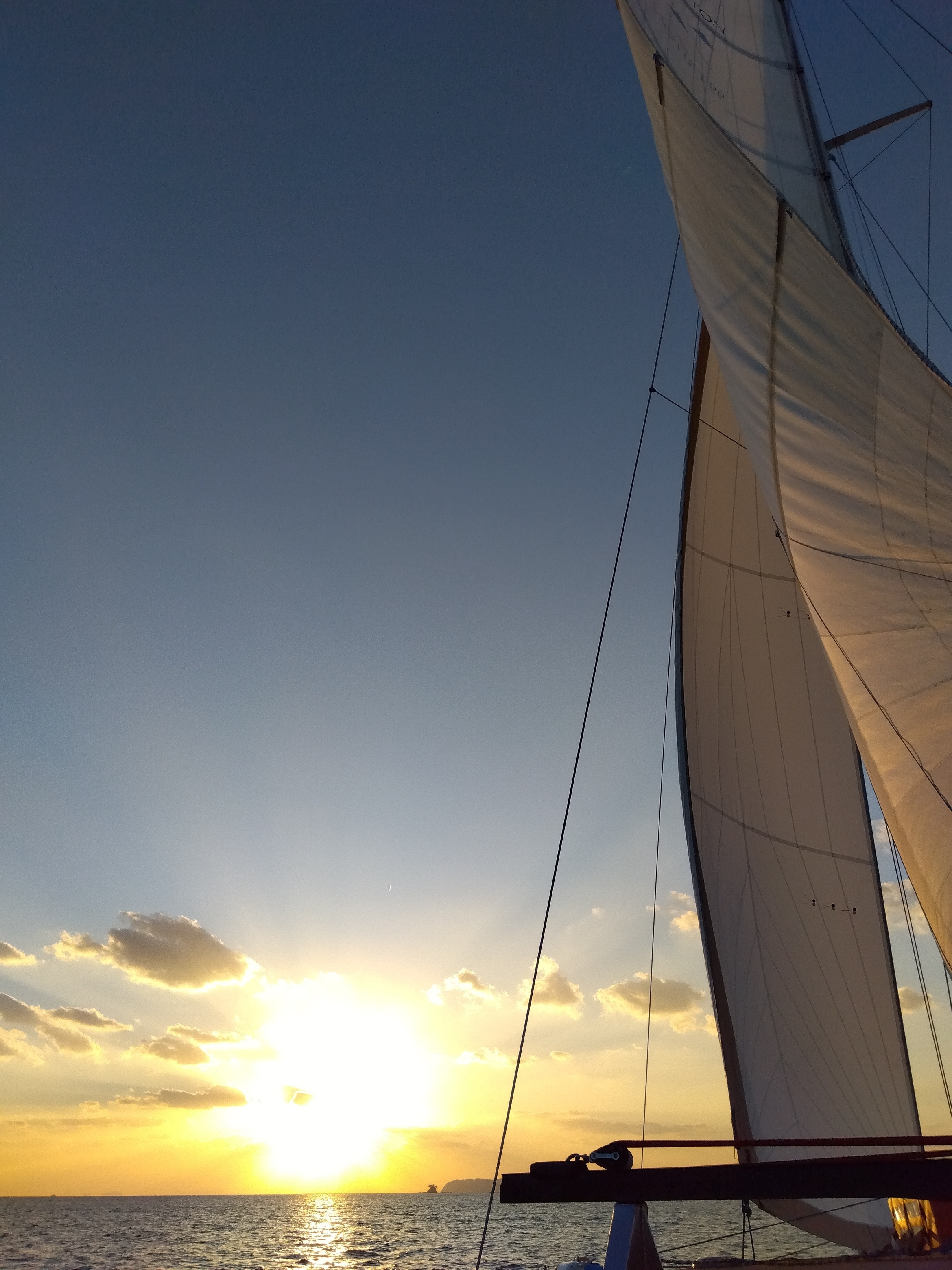 世界で最も美しい湾に認定された九十九島の風景に夕日が溶け込んで空と海の境界線が青色→オレンジ色→紫色と分刻みで色のグラデーションが移り変わっていく景色は必見です。一般的なクルーズと違い双胴船で帆を立てて移動する際は、波のさざ波が心地よいサウンドになって感動を際立たせます。