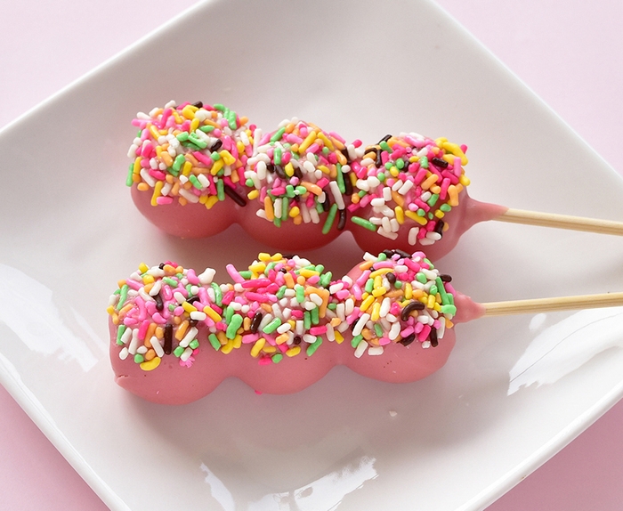 ピンク色のホイップクリームとカラフルチョコスプレーがキュートな冷たいチョコレートドリンク。
