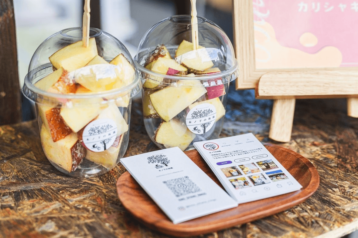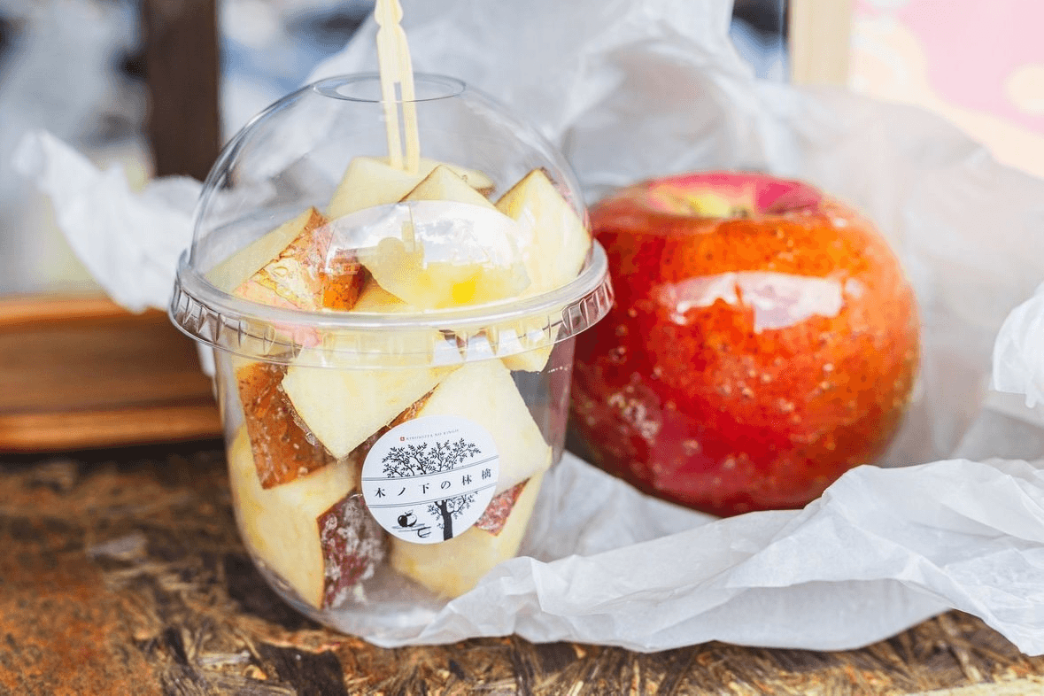 「木ノ下の林檎」では、移動販売でカットりんご飴を販売しています。「こだわりのりんご飴。一度食べるとやめられない、りんご飴の概念が変わる」そんなりんご飴です。その時期に最適な林檎を仕入れてシャキシャキとした食感のあるフジ系統のりんごを使用し、丁寧にりんご飴にしています。また、着色料を使わず飴本来の甘味と林檎の香りが残るようにしています。食感はシャキシャキとした林檎にパリッとしている飴、新感覚のりんご飴を是非ご賞味ください。
